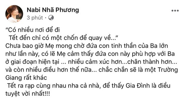 Mới đây, "bà mẹ một con" còn thoải mái thể hiện tình cảm, chia sẻ lại sản phẩm sắp ra mắt của chồng kèm nhắn nhủ ngọt ngào: "Có nhiều nơi để đi. Tết đến chỉ có một chốn để quay về. Chưa bao giờ mẹ mong chờ đứa con tinh thần của ba lớn như lần này, có lẽ mẹ cảm thấy đứa con này phù hợp với ba ở giai đoạn hiện tại, nhiều cảm xúc hơn, chân thành hơn. Và còn nhiều điều hơn thế nữa, chắc chắn sẽ là một Trường Giang rất khác". Không chỉ hết lòng ủng hộ và khen ngợi chồng, Nhã Phương còn khiến dân tình thích thú với cách xưng hô "ba - mẹ" cực tình cảm.