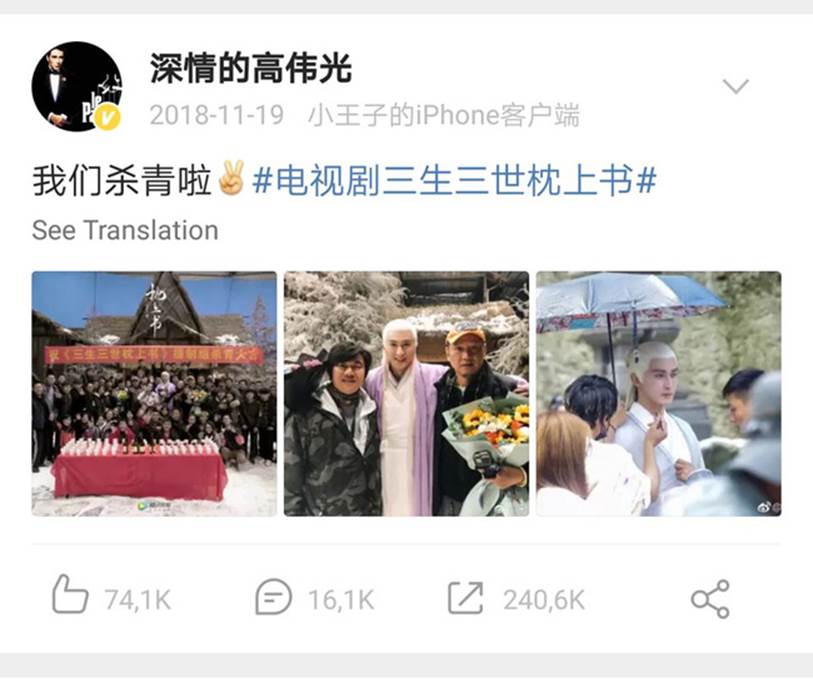 Ngày 11/9/2018, chính Cao Vỹ Quang đã đăng tải bức ảnh kia lên Weibo cá nhân. Chẳng hiểu do quá trình quay phim sung sướng đến cỡ nào mà khi đóng máy, Cao Vỹ Quang lại béo lên trông thấy. Thêm đó, do trong lúc chụp ảnh, Cao Vỹ Quang cố ý làm bản thân thấp xuống nên mới có chuyện không quá chênh lệnh chiều cao so với 2 nhân viên thuộc tổ sản xuất.