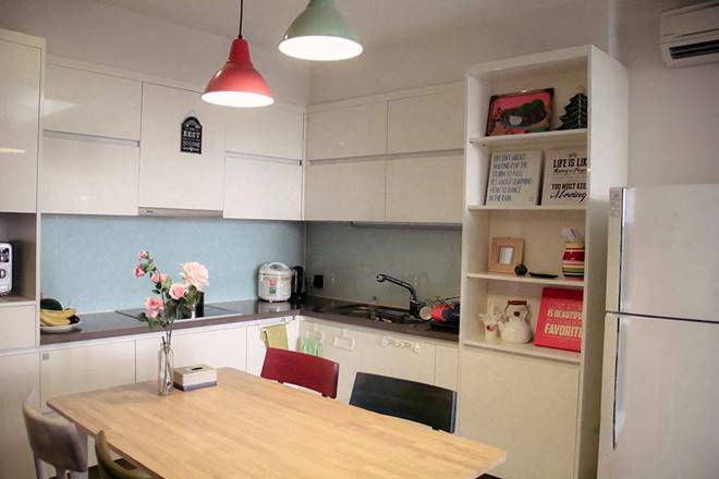 Vợ chồng nam diễn viên khá đầu tư cho việc cải tạo nội thất căn hộ. Khu vực bếp ăn rộng rãi, sạch đẹp được sử dụng tông màu trắng.