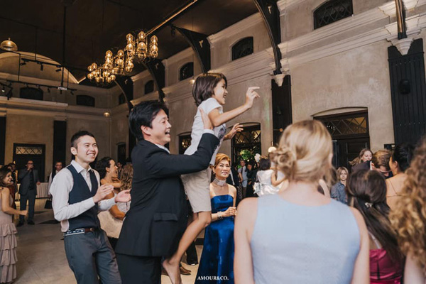 Dễ nhận thấy niềm vui sướng rạng ngời trên gương mặt của cậu bé xinh đẹp. Trong một khuôn hình, cậu còn được người thân bế lên cao như thể nhìn vào trung tâm của phòng cưới xem cô dâu chú rể.