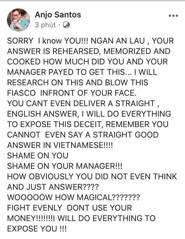 "Thật xin lỗi nhưng tôi biết rõ con người cô. Lê Âu Ngân Anh, câu trả lời của cô đã được viết sẵn, cô đã tập trước và ghi nhớ nó. Cô và quản lý của cô đã bỏ bao nhiêu tiền để mua nó vậy ? Tôi sẽ tìm ra điều này và đập nó thẳng vào mặt cô. Cô chưa bao giờ có thể có những bước đi thẳng hay trả lời câu hỏi bằng tiếng Anh. Tôi sẽ làm mọi thứ để vạch trần sự gian dối này. Tôi nhớ cô còn chẳng trả lời ra hồn được một câu hỏi tiếng Việt cơ mà. Cô thật đáng xấu hổ và quản lý của cô cũng vậy..." - Anjo Santos chia sẻ trên trang cá nhân. Chuyên gia catwalk này bày tỏ sự ngạc nhiên khi Ngân Anh có thể dành được vị trí Á hậu 4. Chúng tôi đang liên lạc với phía Ngân Anh để tìm hiểu sự việc này.