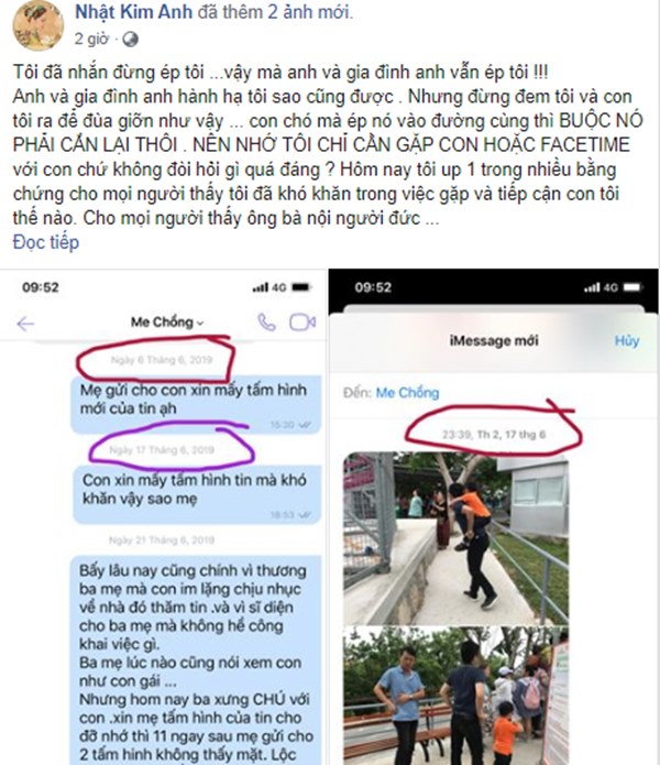 Mới ngày mồng 3 Tết, Nhật Kim Anh đã đăng bài van lạy chồng cũ cho cô gặp con, facetime với con hoặc chỉ nhìn hình con cũng được. Nữ diễn viên còn quay hẳn clip để chứng minh cô không thể gọi điện cho Bửu Lộc vì bị anh chặn số.