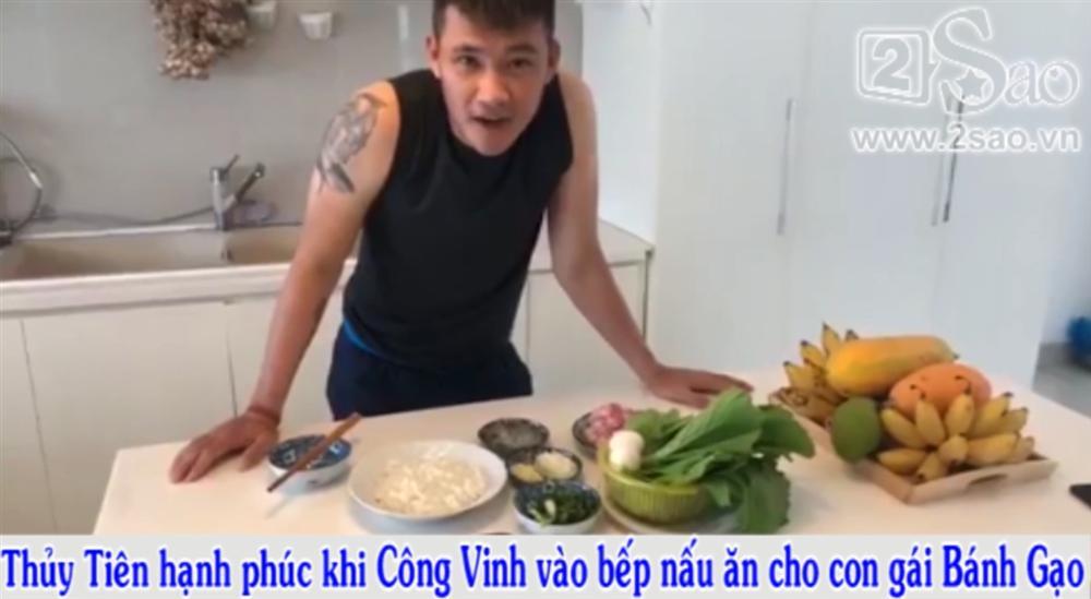 Vừa bấm máy ghi hình, Thủy Tiên vừa giới thiệu về đầu bếp bất đắc dĩ. Theo lời nữ ca sĩ, Công Vinh là người nấu ăn ngon và rất biết chăm chút cho con gái. Mọi điều liên quan tới Bánh Gạo, ông bố họ Lê đều giành làm.