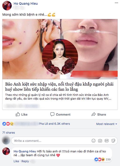 Hồ Quang Hiếu và Bảo Anh công khai chia tay vào tháng 10/2017 khiến nhiều người tiếc nuối. Dù không còn chung đường nhưng Hồ Quang Hiếu - Bảo Anh vẫn coi nhau là bạn bè và dành cho đối phương những lời tốt đẹp. Minh chứng là khi Bảo Anh vướng tin đồn yêu thủ môn Bùi Tiến Dũng, Hồ Quang Hiếu chia sẻ: “Nếu cô ấy và Bùi Tiến Dũng yêu nhau thật thì tốt thôi, chứ không có gì". Khi bạn gái cũ phải nhập viện và hủy hàng loạt show, giọng ca "Con bướm xuân" cũng thể hiện sự quan tâm.