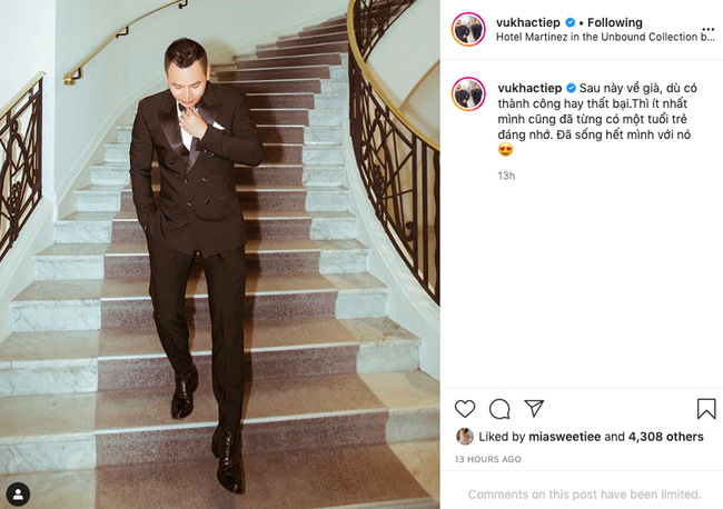 Ngay sau khi có thông tin cách ly, Vũ Khắc Tiệp chia sẻ trên mạng xã hội hình ảnh cũ của mình kèm lời chiêm nghiệm: "Sau này về già, dù có thành công hay thất bại.Thì ít nhất mình cũng đã từng có một tuổi trẻ đáng nhớ. Đã sống hết mình với nó".