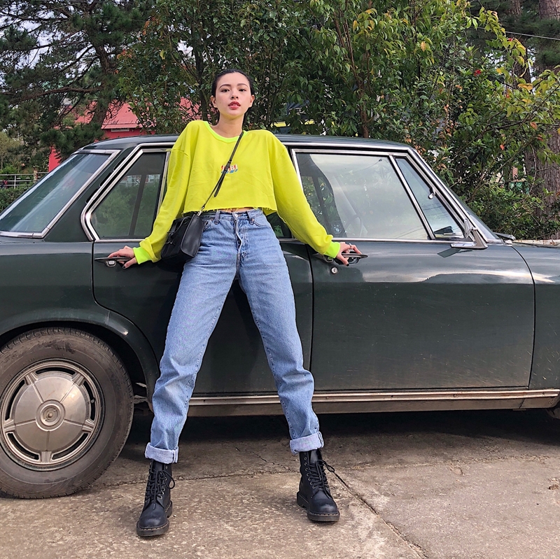Combat boots là phụ kiện đắc lực cho phép cộng quần jeans và crop top vàng rực của Tú Hảo.