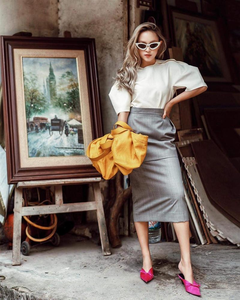 Châu Bùi luôn biết cách thu hút mọi ánh nhìn bằng cách phối phụ kiện màu sắc ấn tượng gồm giầy cắt chữ V và kính mắt mèo nhấn nhá cho set đồ công sở quen thuộc.