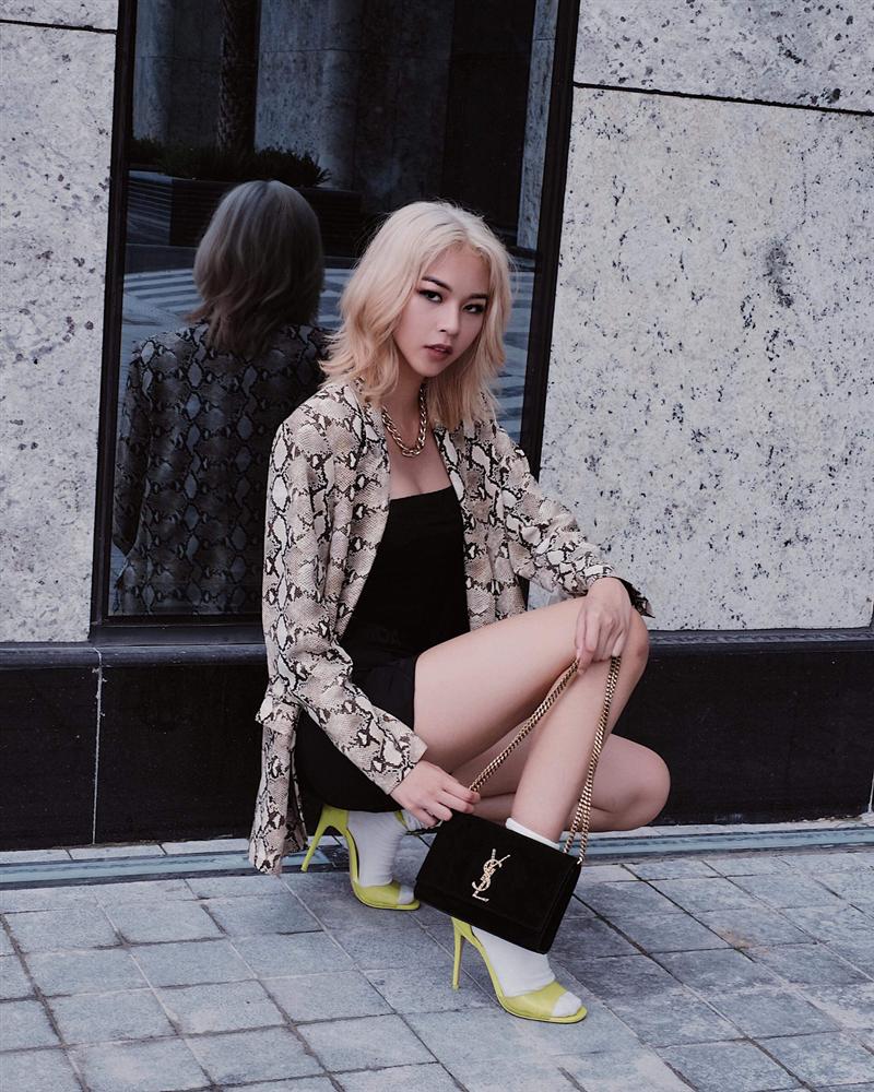 Một Phí Phương Anh khác hẳn với mái tóc ngắn nhuộm vàng. Quán quân The Face mùa đầu tiên khoe đôi chân thon dài trong chiếc váy quây ngắn cũn mix&match với áo blazer họa tiết ấn tượng, giầy cao gót màu vàng chanh.