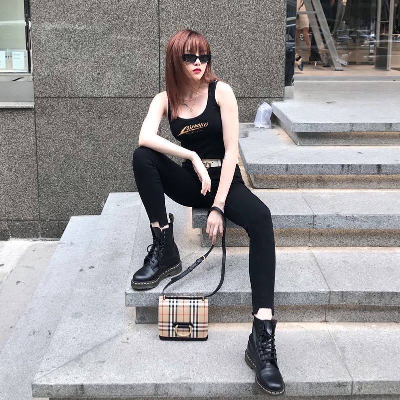 Diện cả set đồ đen tuyền, Thiều Bảo Trâm phô diễn được vẻ đẹp gợi cảm không kém phần khỏe khoắn. Điểm nhấn của bộ trang phục là chiếc túi xách dáng hộp của Burberry với họa tiết kẻ caro đặc trưng.