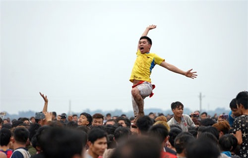 Một thanh niên đạp lên trên đám đông để tranh giành quả phết cầu may trong lễ hội phết