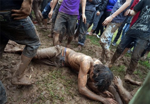 Nạn nhân của đám đông cuồng tín. Một thanh niên kiệt sức nằm nhoài trên bùn sau khi tranh cướp vận may không thành công ở Hội Phết Hiền Quan.