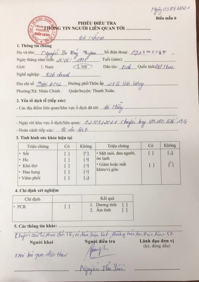 Theo thông tin trên phiếu điều tra này, thời gian là ngày 3/5/2021, trong đó có nêu chuyến bay từ Đà Nẵng về Hà Nội của vợ chồng ông T. là chuyến VN160 ngày 2/5/2021.