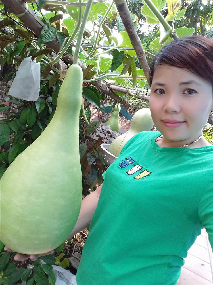 Ấn tượng nhất trong khu vườn của nữ nông dân phố này là giàn bầu với những trái to nặng cả chục kg. Đây là giống bầu hồ lô "khủng" của người dân tộc Mông tại Xín Mần, Hà Giang.