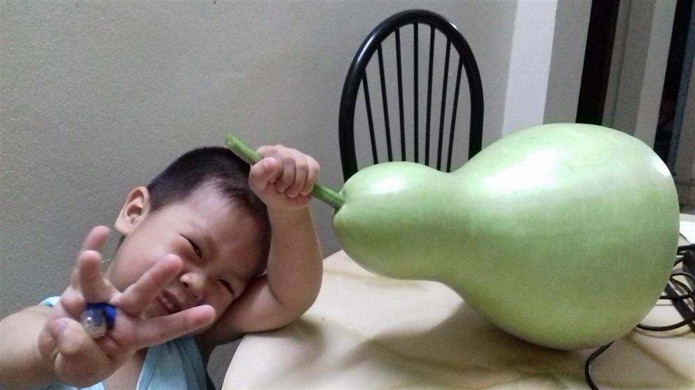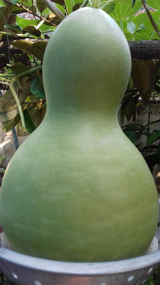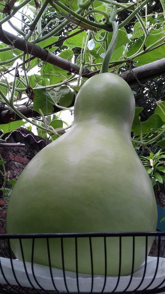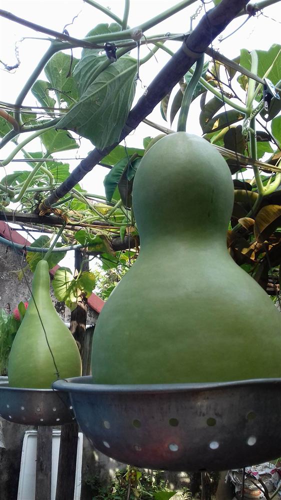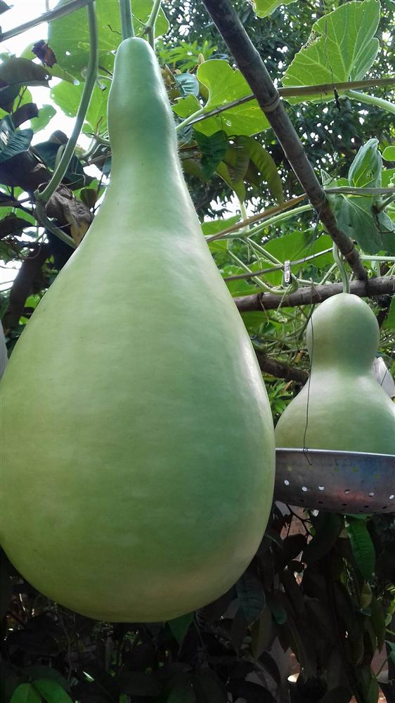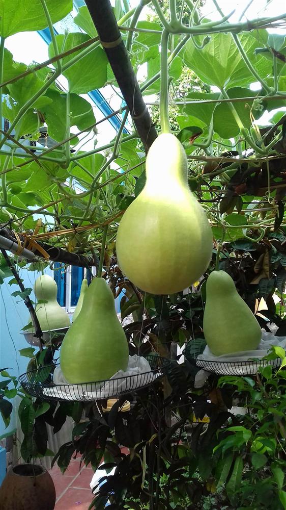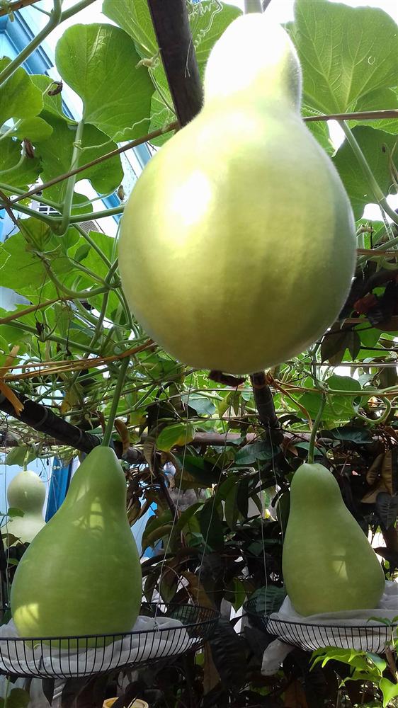 "Giống bầu này rất sai quả, quả rất to và khủng. Trung bình, mỗi quả khi thu hoạch đều cho từ 7-10kg. Vì bầu tiên hồ lô quá nặng nên nhiều khi mình phải dùng tất cả những gì trong nhà để làm "bà đỡ" cho bầu".