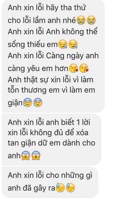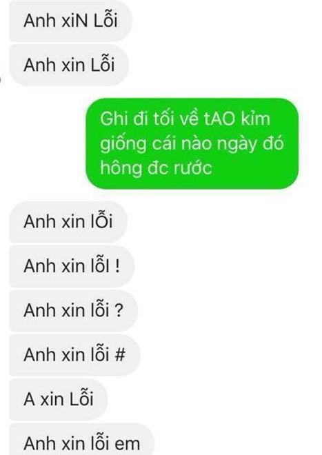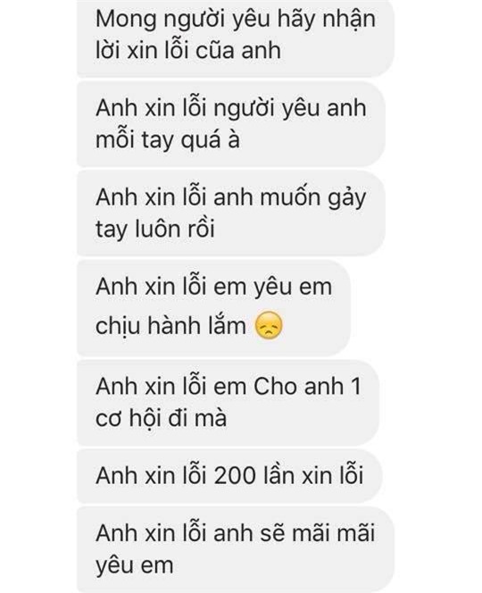 Những đoạn chat này được chính cô bạn gái đăng lên. Có thể thấy, chàng trai dường như đã làm gì nên tội khiến bạn gái giận, và cô đã đưa ra một "yêu sách" là hãy xin lỗi bằng 200 câu khác nhau. Điều bất ngờ là chàng trai làm đúng y chang vậy - xuống nước xin lỗi bằng đủ mọi cách từ thay đổi viết hoa từng chữ cái cho tới "Xin lỗi đất, xin lỗi trời, xin lỗi anh mãi mãi yêu em...". Dù chỉ nhận lại sự im lặng từ phía bên kia nhưng có vẻ anh chàng vẫn không hề nản chí hay cáu giận.