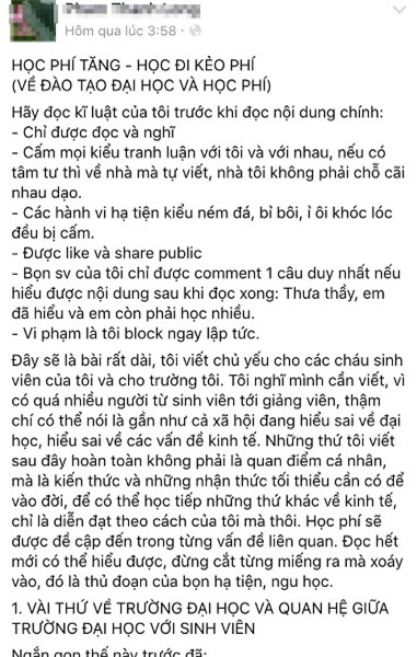 Trong lúc dư luận đang sôi sục về chuyện học phí tăng cao chóng mặt, gây áp lực lên nhiều sinh viên thì mới đây, thầy P.T.L, giảng viên NEU đã lên mạng chia sẻ bài viết “Học phí tăng – Học đi kẻo phí”. Bài viết khẳng định trường học là một doanh nghiệp, tri thức là hàng hóa, quan hệ sinh viên - nhà trường là mua - bán khiến không ít người phải... giật mình.