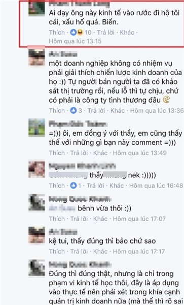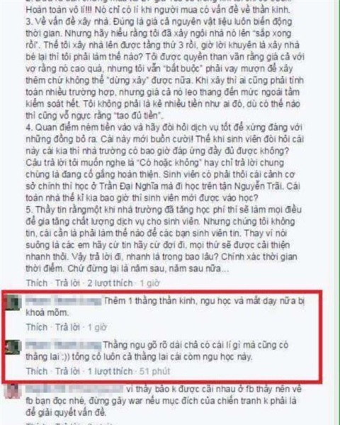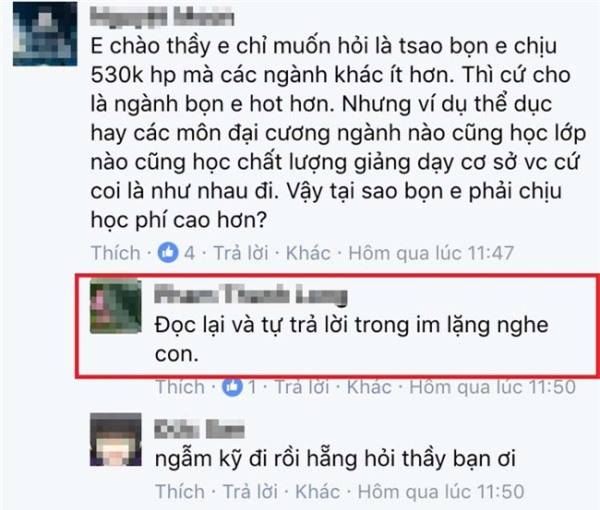 Bạn M.N. thắc mắc hỏi: "Thưa thầy, em chỉ muốn hỏi là tại sao bọn em chịu 530 nghìn/tín chỉ mà các ngành khác ít hơn. Thì cứ cho là ngành bọn em hot hơn, nhưng ví dụ như thể dục hay các môn học đại cương ngành nào cũng học lớp nào, cũng học chất lượng giảng dạy cơ sở vật chất là như nhau đi. Vậy tại sao lại học mức học phí cao hơn?". Đáp lại, thầy L. bình luận: "Đọc lại và tự trả lời trong im lặng nghe con". Hay có sinh viên thắc mắc thì giảng viên này liền comment "Ai dạy ông này kinh tế vào rước đi hộ tôi cái. Xấu hổ quá. Biến".