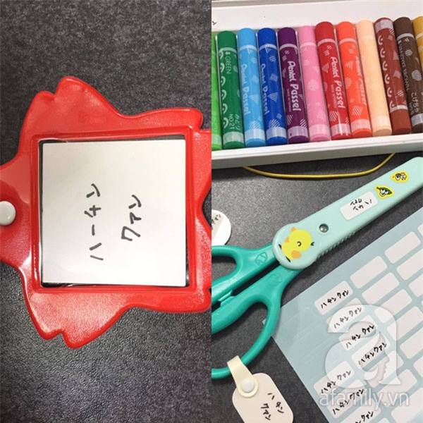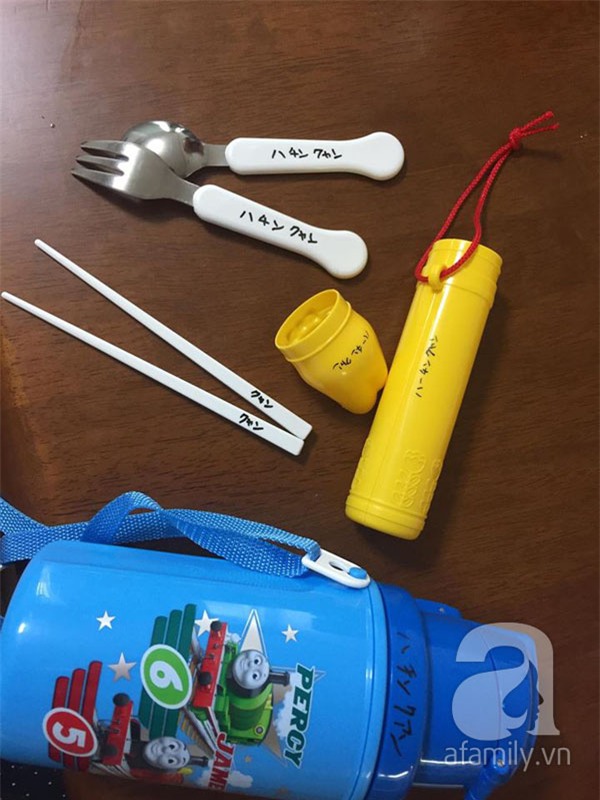 Sau khi mua sắm xong xuôi cũng là lúc người mẹ trổ tài khéo léo và tỉ mẩn để đánh dấu tên con lên đồ đạc của mình. Tôi từng nghe kể trước đây các bà mẹ Nhật vất vả tới nỗi phải tự tay may bảng tên với kích thước chuẩn, và thêu tên của con mình lên từng món đồ rồi đính lên vị trí đã được quy ước sẵn. May thay ngày nay, người ta đã chuẩn bị sẵn bảng tên trên các món đồ của trẻ, và bạn chỉ việc mua bút dạ không trôi viết lên là xong.