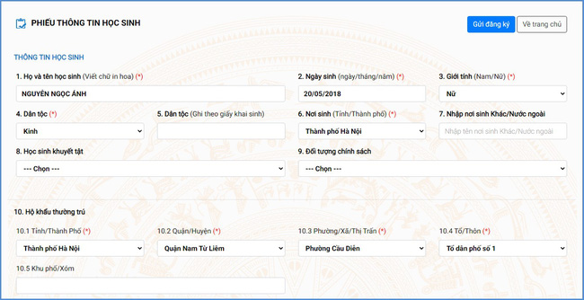 - Để học sinh được học đúng tuyến phụ huynh cần nhập chính xác về diện cư trú (Hộ khẩu thường trú, Nơi ở hiện nay).