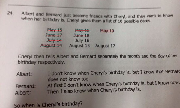 Albert và Bernard là hai người bạn mới của Cheryl. Cả hai muốn biết ngày sinh nhật của Cheryl. Cheryl sau đó đã đưa ra 10 đáp án như sau: Ngày 15/5, Ngày 16/5, Ngày 19/5, Ngày 17/6, Ngày 18/6, Ngày 14/7, Ngày 16/7, Ngày 14/8, Ngày 15/8, Ngày17/8.