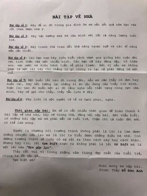 Mới đây, một thầy giáo có tên Đỗ Đức Anh (giáo viên Văn trường THPT Bùi Thị Xuân, thành phố Hồ Chí Minh) đã giao những bài tập về nhà đặc biệt cho học sinh lớp 10A9 khiến cộng đồng mạng xúc động.