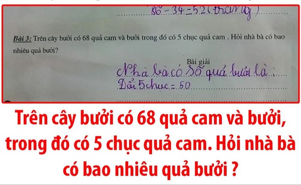 "Trên cây bưởi có 68 quả cam và bưởi, trong đó có 5 chục quả cam. Hỏi nhà bà có bao nhiêu quả bưởi?".