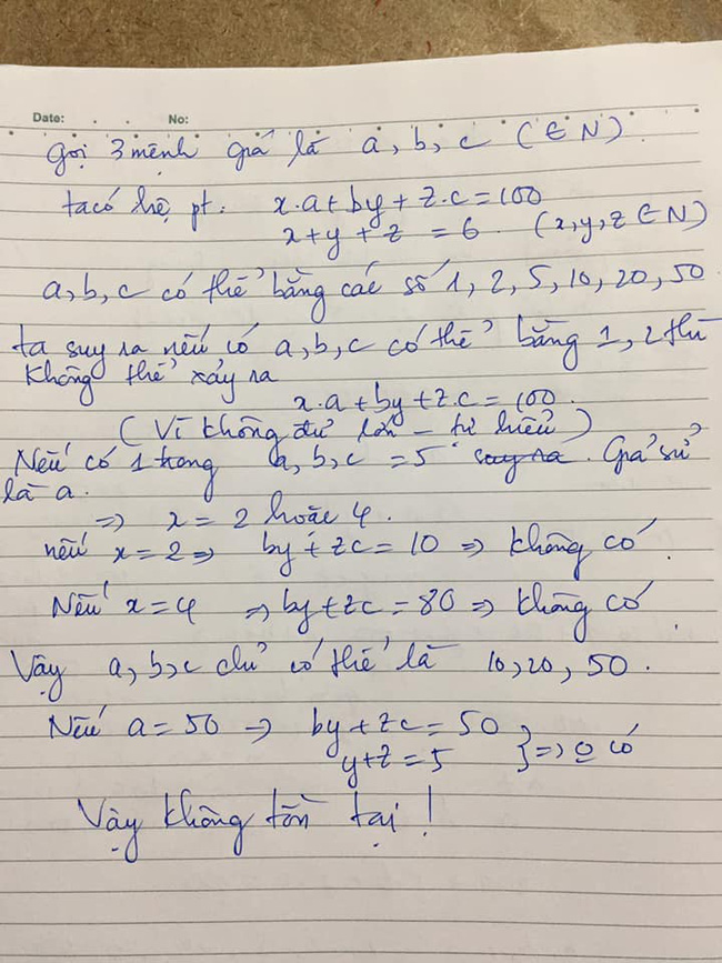 "Có hệ phương trình: 50a+20b+10c=100 và a+b+c=3 => Hệ phương trình này sẽ vô nghiệm nếu a, b, c đều là số nguyên".