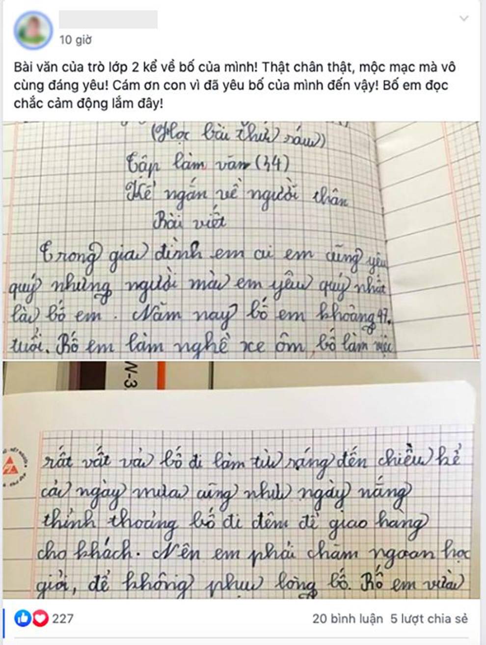 Em không ngại ngần thừa nhận bố em làm xe ôm - công việc mà có lẽ nhiều người cảm thấy ngượng ngùng khi có bố làm nghề đó. Em thấu hiểu sự vất vả của bố, dầm mưa dãi nắng để kiếm tiền nuôi em ăn học. Dù chỉ là một đoạn văn rất ngắn, câu chữ còn ngây ngô, nhưng bài văn của em học trò lớp 2 này khiến nhiều người lớn cảm thấy xúc động. Nguyên văn bài văn như sau: