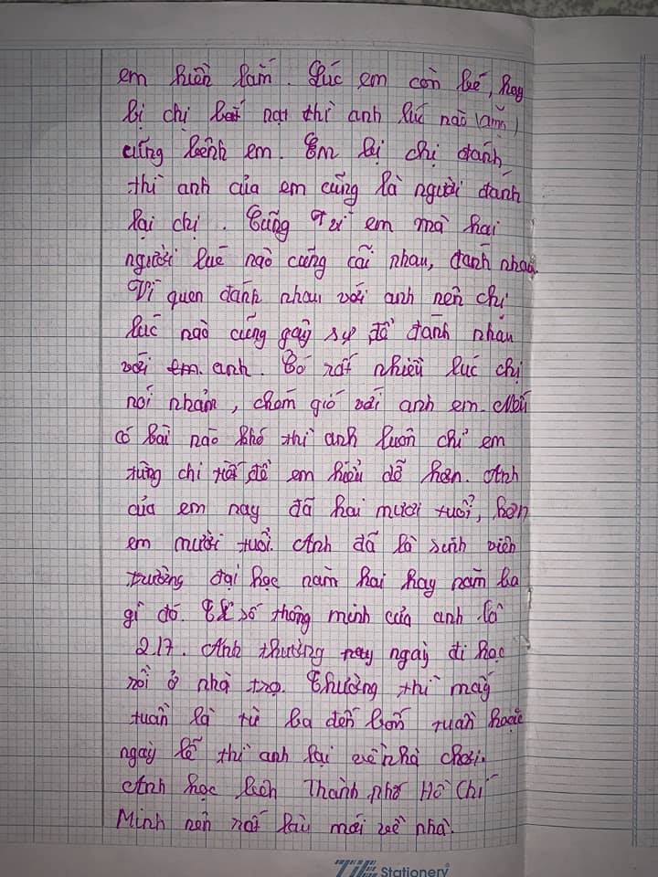 Mới đây, một tài khoản facebook có tên T.Đ.V đã chia sẻ lên mạng xã hội bài văn tả anh trai của em gái mình. Ngay từ những dòng văn đầu tiên, có thể thấy cô bé rất yêu mến anh khi khẳng định: "Anh là người hay chỉ em bài tập, bênh vực em nhất". Tiếp theo đó, cô bé liên tục khen ngợi anh bằng nhiều mỹ từ như "đẹp trai", "chân mày đậm", "mũi cao", "thanh tú",... Không chỉ vậy, cô bé còn kể lại những lần anh trai... đánh nhau với chị gái để bênh vực mình!