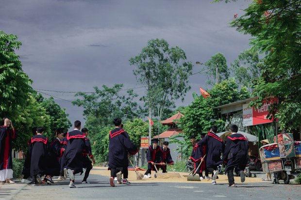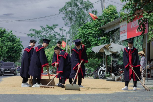 Mới đây, trên mạng xã hội có chia sẻ loạt ảnh kỷ yếu của lớp 12D khiến cộng đồng mạng vô cùng thích thú. Trong ảnh, các bạn học sinh mặc trang phục áo cử nhân đang vội vàng cào thóc được phơi dưới lòng đường giúp người dân.