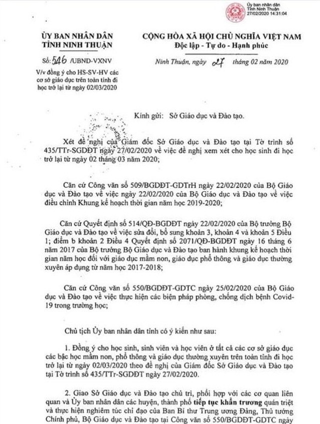 Chiều 27/2, UBND tỉnh Ninh Thuận đã có văn bản gửi Sở Giáo dục và Đào tạo (GD&ĐT) về việc đồng ý cho học sinh, sinh viên các cơ sở giáo dục trên toàn tỉnh đi học trở lại từ ngày 2/3/2020.