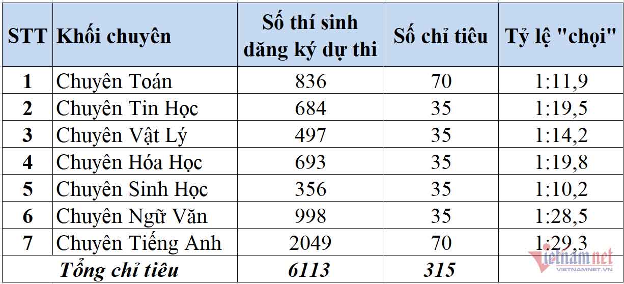 Năm 2023, các thí sinh cạnh tranh cho 315 suất vào các lớp chuyên của Trường THPT Chuyên ĐH Sư phạm Hà Nội (gồm các lớp Toán, Tin học, Vật lý, Hóa học, Sinh học, Ngữ văn và Tiếng Anh). Chỉ tiêu của khối chuyên Toán là 70, khối chuyên Tiếng Anh là 70, các khối chuyên còn lại là 35. Năm nay, nhà trường tăng 10 chỉ tiêu và chỉ thay đổi ở khối chuyên Tiếng Anh.