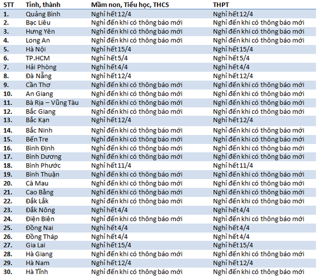 Tính đến ngày 28/3, 63 tỉnh thành trên cả nước đều đã kéo dài thời gian nghỉ học của học sinh tất cả các cấp. Đặc biệt có nhiều tỉnh đã quyết định cho học sinh THPT nghỉ học dù trước đó đã đi học lại được 1-2 tuần.