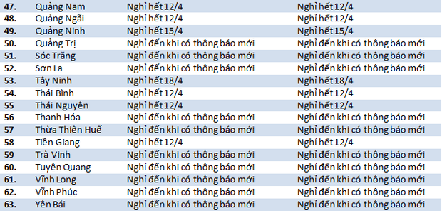 Tỉnh kéo dài thời gian nghỉ học của học sinh lâu nhất là tỉnh Tây Ninh (đến hết ngày 18/4). Một số tỉnh vẫn chưa quyết định thời gian trở lại là: Quảng Trị, Phú Yên, Nam Định, Lai Châu, Kon Tum, An Giang...