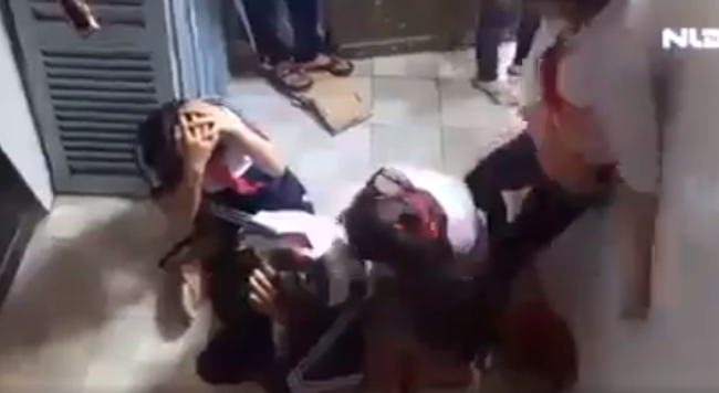 Trong khi đó, nhóm nữ sinh bị đánh không chống cự, chỉ gập người xuống và ôm đầu để tránh những trận đòn.