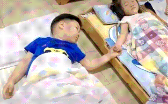 Trong một góc ảnh, con gái họ và một cậu bé khác đang nắm tay nhau khi ngủ.
