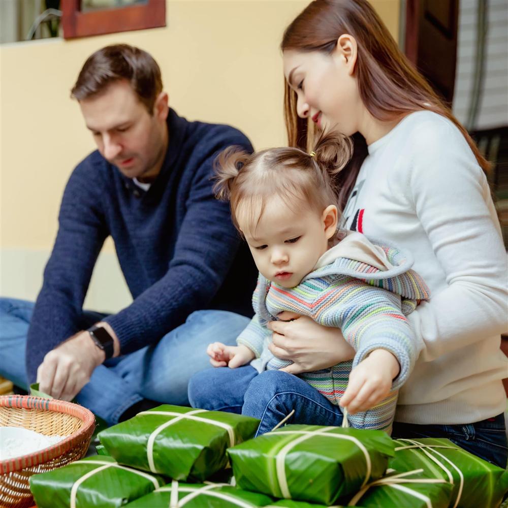 Ngày Tết Nguyên Đán, Lan Phương cùng chồng và con gái học gói bánh chưng.