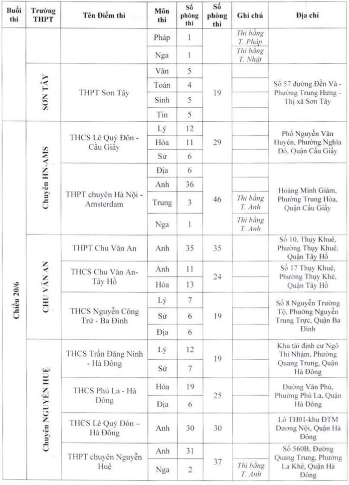 Trong khi đó, các điểm thi vào lớp 10 chuyên sẽ được đặt tại các trường: THPT chuyên Hà Nội Amsterdam, THCS Ba Đình, THPT Chu Văn An, THCS Lê Quý Đôn - Hà Đông, THPT Chuyên Nguyễn Huệ, THPT Sơn Tây, THCS Lê Quý Đôn - Cầu Giấy, THCS Nguyễn Công Trứ - Ba Đình, THCS Trần Đăng Ninh - Hà Đông, THCS Phú La - Hà Đông.