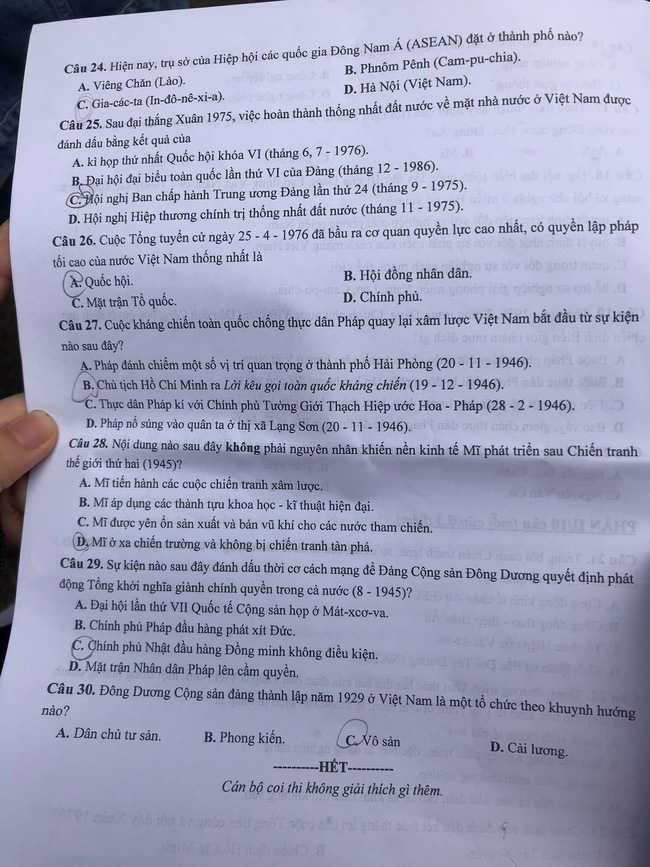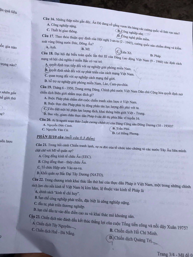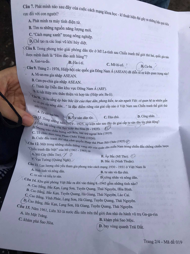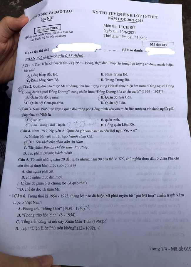 Đáp án đề thi lớp 10 môn Lịch sử ở Hà Nội năm 2021 mã 008 và 007.