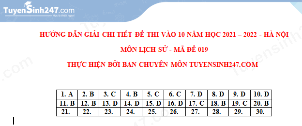Đáp án đề thi lớp 10 môn Lịch sử ở Hà Nội năm 2021. Nguồn: Tuyển sinh 247