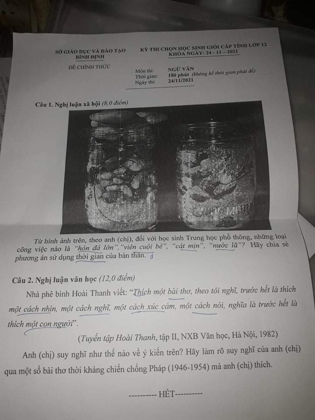 Đề thi học sinh giỏi tất nhiên phải khó, nhưng bạn đã từng nghĩ đến một chiếc đề với câu hỏi chỉ toàn... hình ảnh chưa? Một đề thi Văn mới đây từ tỉnh Bình Định được chia sẻ đang khiến dân tình toát mồ hôi hột. Ở câu 1 (8 điểm) Nghị luận xã hội, thay vì một câu hỏi về một tác phẩm như thông thường, đề chỉ có vỏn vẹn... 2 bức ảnh. Yêu cầu đưa ra chính là: Từ hình ảnh trên, theo anh (chị), đối với học sinh Trung học phổ thông, những loại công việc nào là "hòn đá lớn"; "viên cuội bé"; "cát mịn"; "nước lã". Hãy chia sẻ phương án sử dụng thời gian của bản thân.