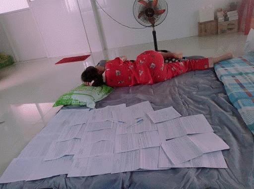 Nhìn hình ảnh này không ít người cười bò và nhớ lại mình năm nào. Cứ đến mùa thi là quyết tâm ôn tập lắm nhưng đến khi mở sách ra thì bao nhiêu quyết tâm lại tan hết thành ‘bọt biển', lập tức nằm lăn ra giường dưỡng da như hình ảnh học sinh bên trên.