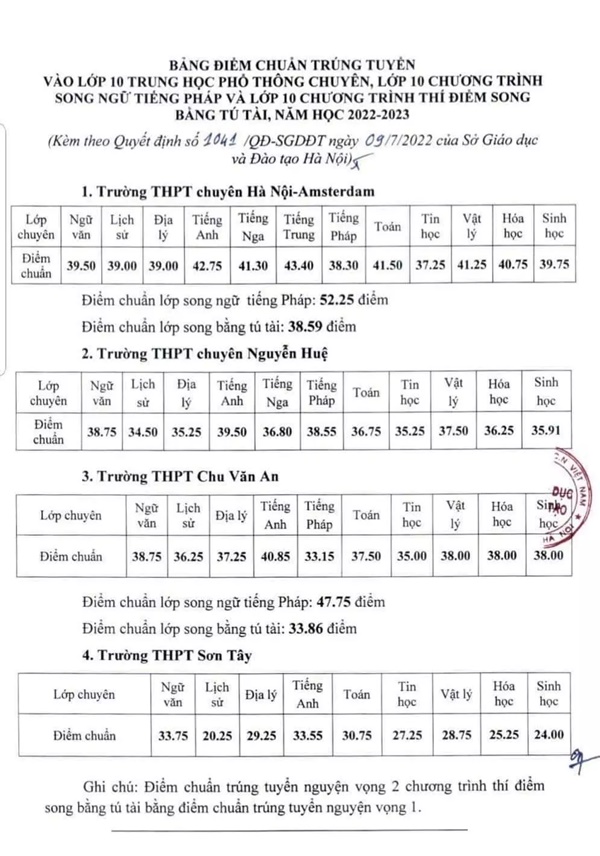 Cụ thể, điểm chuẩn vào lớp 10 các trường chuyên/trường có lớp chuyên của Hà Nội năm 2022 như sau: