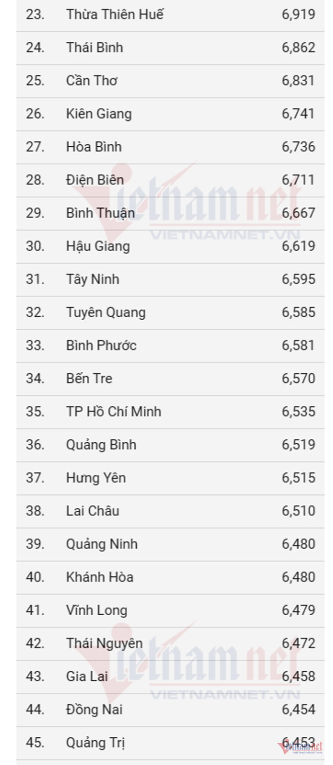 Ở chiều ngược lại, Lai Châu, Hà Giang và Kon Tum giữ 3 vị trí cuối bảng khi lần lượt có mức điểm trung bình là 5,040; 5,252 và 5,373.