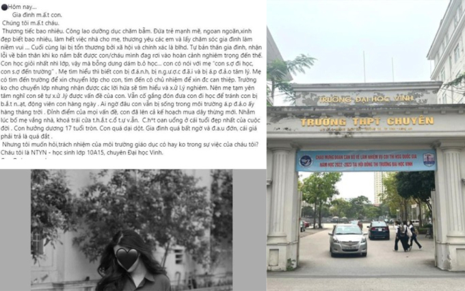 Vào tháng 4/2023, trên mạng xã hội xuất hiện bài viết của một tài khoản Facebook tự nhận là người thân của nữ sinh N.T.Y.N. - học sinh lớp 10 Trường THPT chuyên ĐH Vinh đăng tải thông tin với nội dung: "Gia đình mất con, chúng tôi mất cháu. Thương tiếc bao nhiêu công lao dưỡng dục chăm bẵm. Đứa trẻ mạnh mẽ, ngoan ngoãn, xinh đẹp biết bao nhiêu, làm hết việc nhà cho mẹ, thương yêu các em và lấy chăm sóc gia đình làm niềm vui… Cuối cùng lại bị tổn thương bởi xã hội và chính xác là bạo lực học đường".