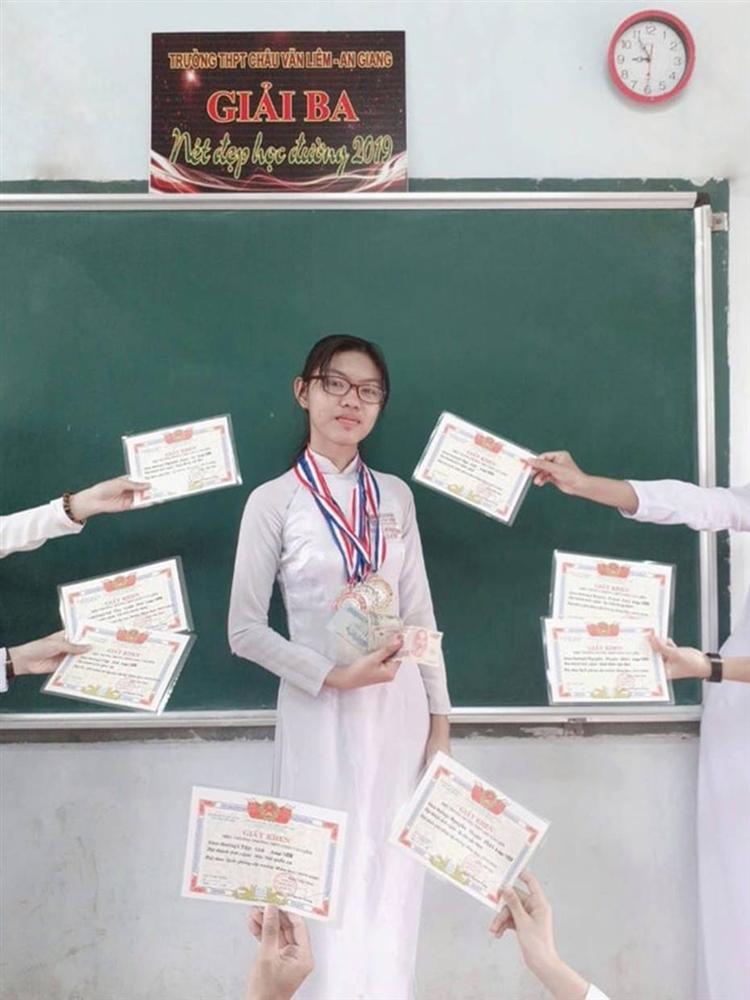 Liên hệ với nhân vật chính trong bức ảnh, cô bạn có tên Lê Nguyễn Phương Vy, học sinh lớp 12 Trường THPT Châu Văn Liêm, An Giang. Được biết, Phương Vy vừa là lớp trưởng vừa được giao trọng trách cao cả giữ gìn cẩn thận loạt giấy khen, huy chương thành tích chung của cả lớp.
