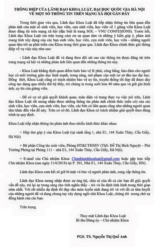 Trong văn bản này, lãnh đạo khoa cho biết đã tiếp nhận thông tin liên quan đến phản ánh của một số sinh viên, học viên, cựu sinh viên về một giảng viên khoa Luật được đăng tải trên mạng xã hội (đặc biệt là trang SOL – VNU CONFESIONS).
