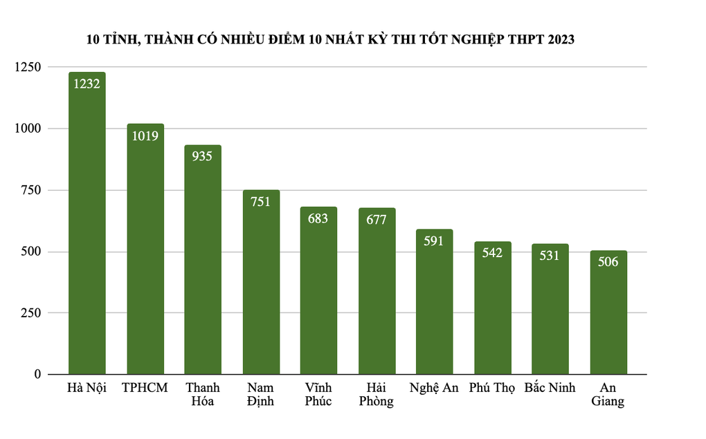 Tuy không tính hơn 16000 thí sinh nói trên, Hà Nội vẫn dẫn đầu 63 tỉnh thành về số điểm 10 với 1.232/16.427 bài thi, chiếm 7,49%. Con số này nhiều hơn TP.HCM 213 bài thi và gấp 2,43 lần địa phương đứng thứ 10 trong bảng xếp hạng là An Giang.