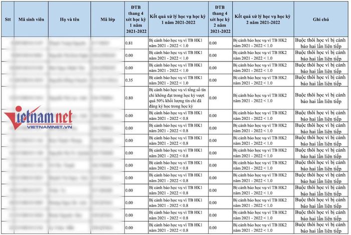 Họ đều có điểm trung bình theo thang 4 dưới 1 điểm liên tiếp 2 học kỳ (1, 2) năm 2021-2022 và đã bị cảnh báo học vụ. Sau 2 lần liên tiếp bị cảnh báo, tất cả bị buộc thôi học.