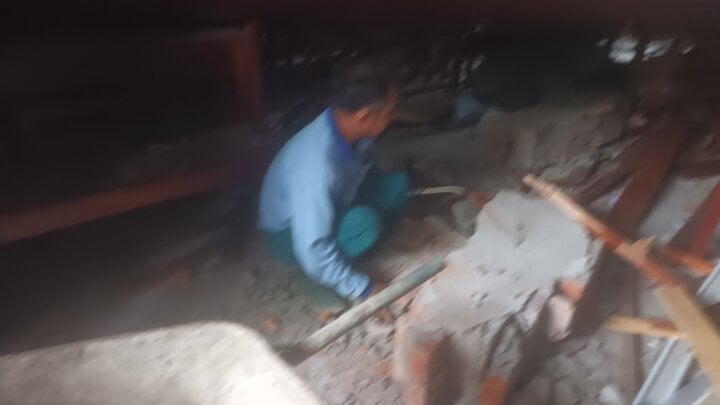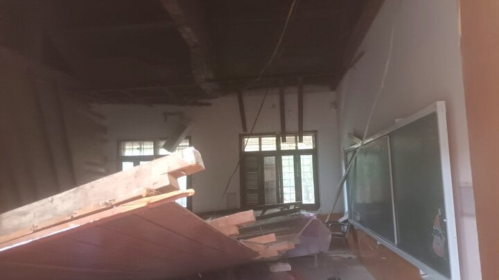 Trần gỗ của lớp học với trọng lượng lớn bất ngờ rơi xuống, nhiều bàn ghế trong lớp cũng bị sập gãy.
